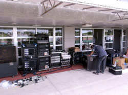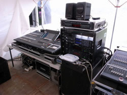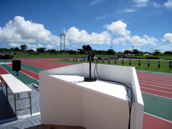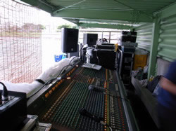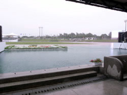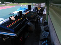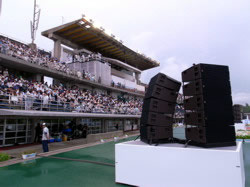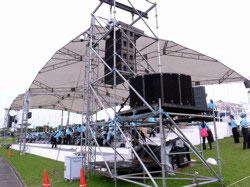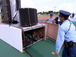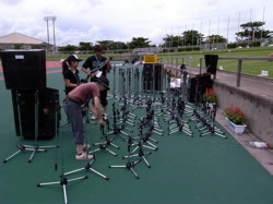 本番の開始時刻には雷も鳴る豪雨です。その最中、本番遅延告知アナウンスが全天候タイプの